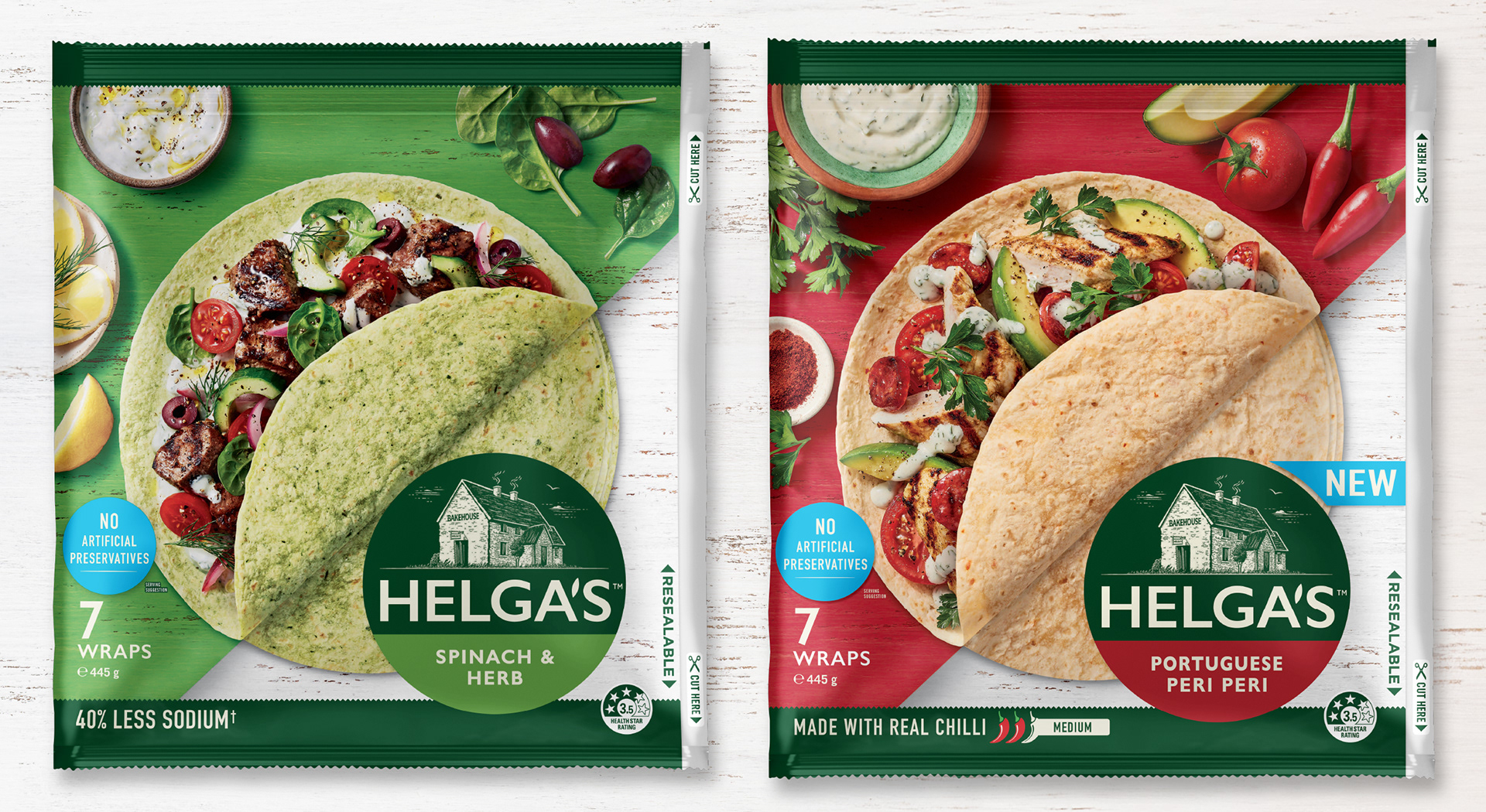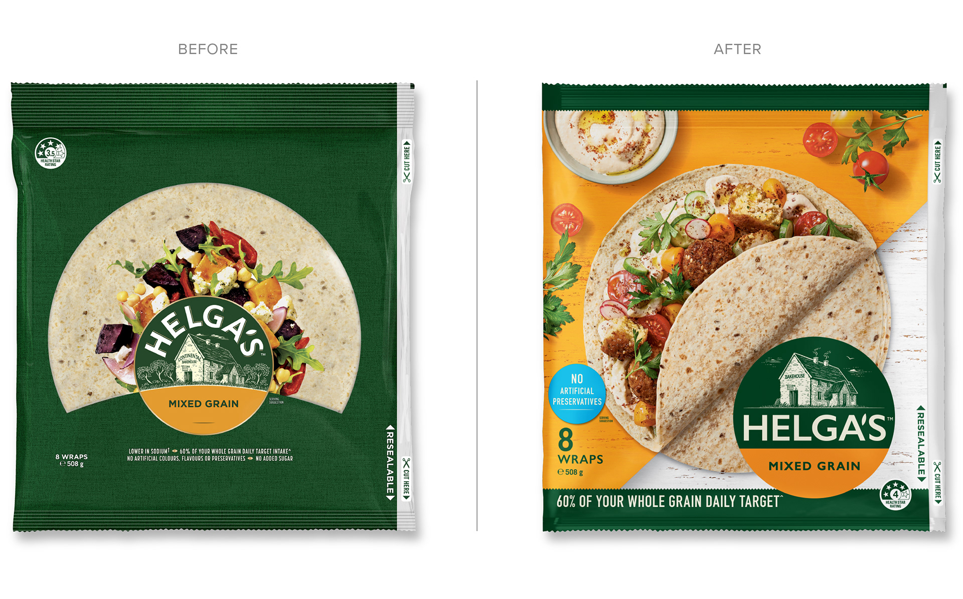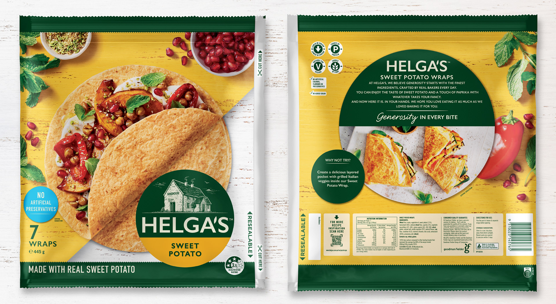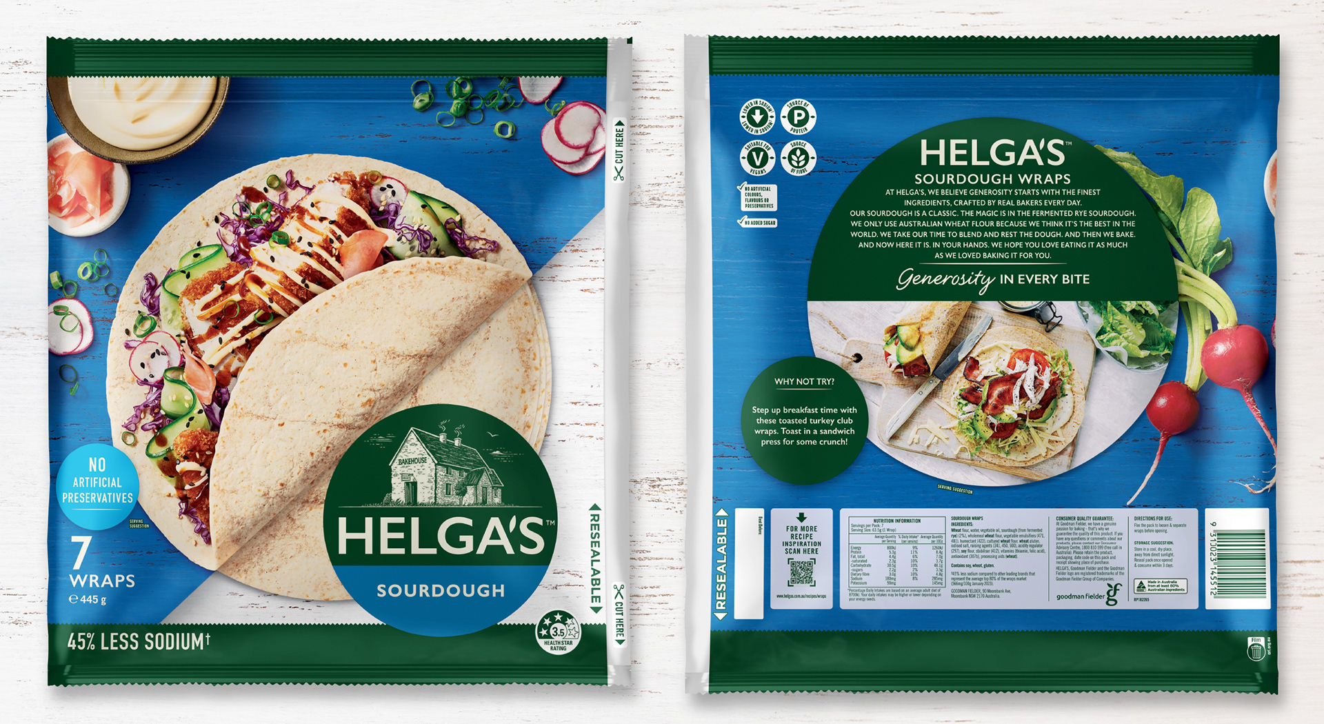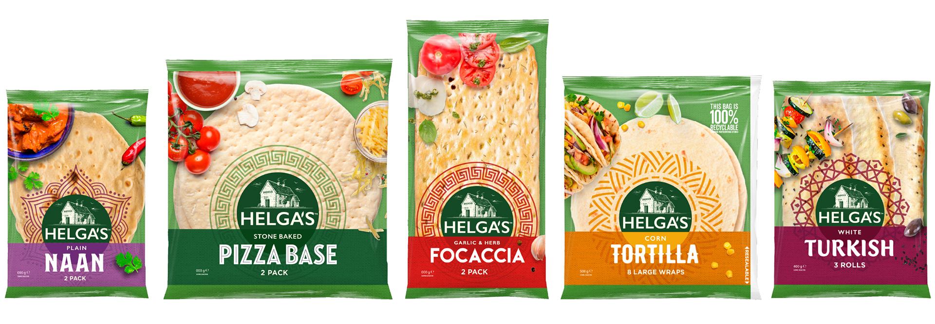 From the classics to flavoured, minis and Plus+, Helga’s wraps make mealtimes effortless - perfect for a quick lunch or an easy dinner. The refreshed packaging design is built around the simple, clever idea of literally wrapping a wrap. The result is a fresh, vibrant and appetising design system that captures the warmth, versatility and everyday appeal of the Helga’s range. Created in collaboration with Barker Brand Partners.